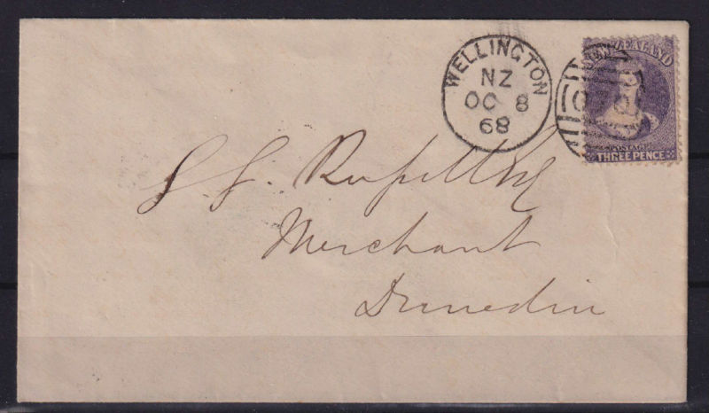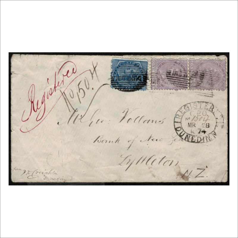 Cover with 2d Blue SG 113 tied by light Obliterator cancel with Napier cancel at left addressed to George Gray Russell, Dunedin. Also a straight line ‘LATE FEE’ handstamp. Backstamped with Red Dunedin cancel. (George Russell was a General Merchant)