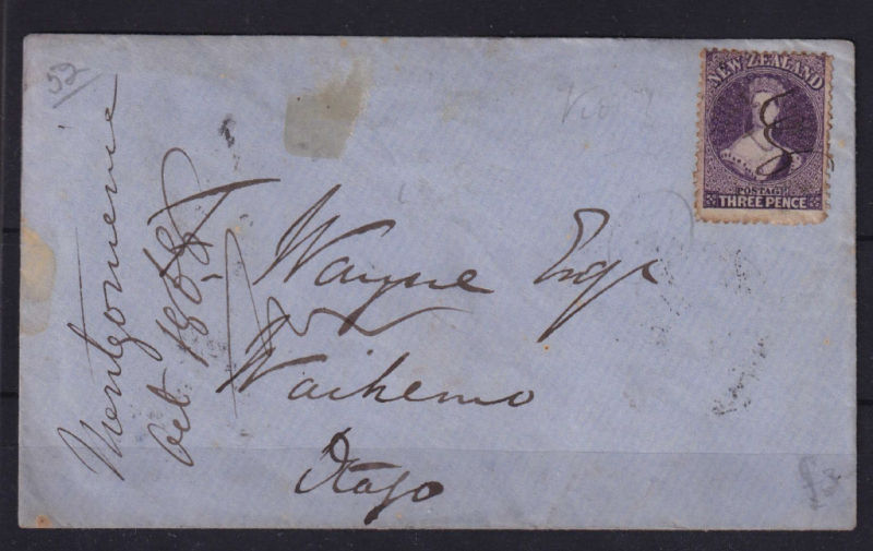 with Perforated 3d Mauve SG 118 cancelled by ‘M’ Manuscript cancel addressed to Waihemo, Otago. Backstamped Mataura & Dunedin cancels. The cover has a hinge remenants on the front. Southland Postal District Cover (1) (Image)