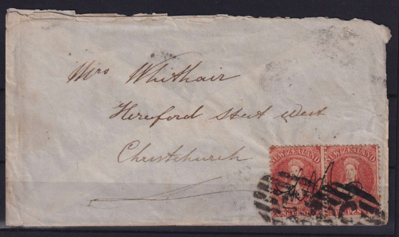 Christchurch with Perforated 1d Red SG 110 Pair cancelled with Manuscript ‘Salt Water Creek’ cancel and tied by Obliterator ‘C’ cancels. PO Open 1859-1925. Backstamped Christchurch/Canterbury AP 20 1868 cancel. The cover has a slight tear on the