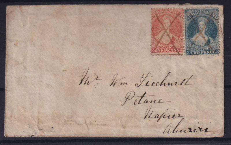 with Perforated 1d Orange SG 111 & 2d Blue SG 114 both with a Manuscript ‘X’ addressed to Petane,Napier,Ahuriri. Backstamped Wellington & Napier. The cover has ageing and light creases at the bottom. (1) (Image)