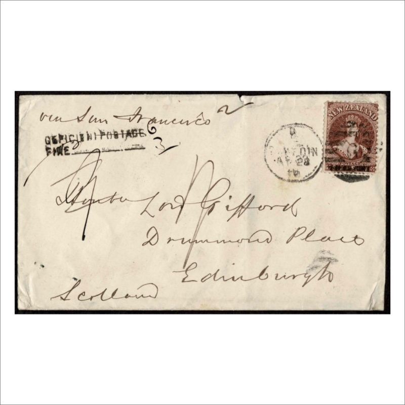 Cover to Edinburgh,Scotland with Perforated 6d Red Brown SG 122 tied by Dunedin/O cancel. Endorsed ‘Via San San Francisco’ Has Postage Due ‘Deficient Postage (6)/Fine ..(3) 2 line cachet at top left. Minor edge faults. Backstamped Edinburgh. (1) (Image)