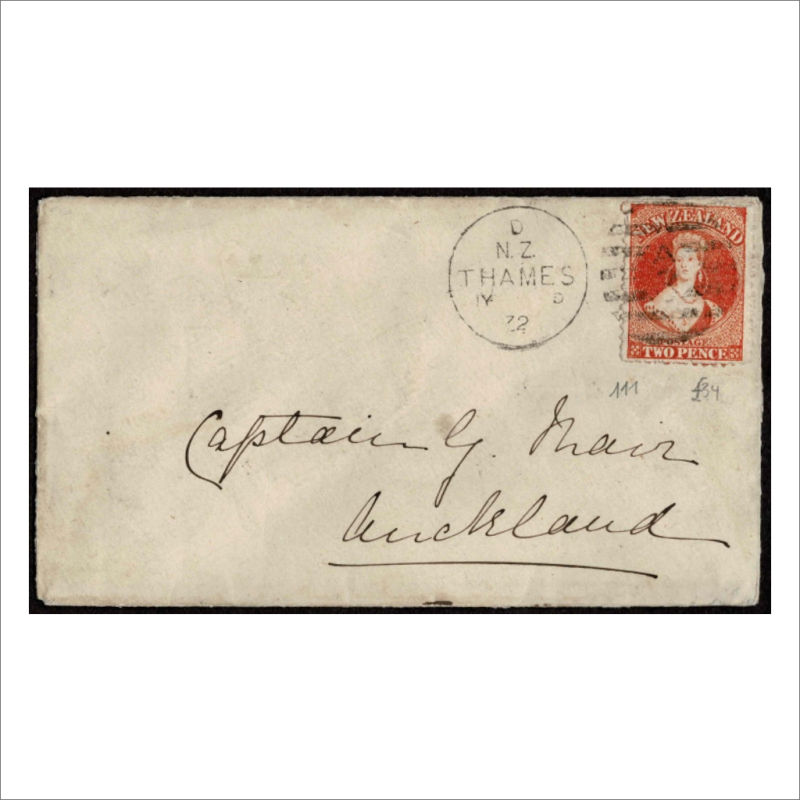 with 2d Orange SG 133 tied by Thames/A over 3 cancel addressed to Captain G Mair, Auckland. Backstamped Auckland. (Captain Mair was one of 23 Recipients of the NZ Cross for Gallantry for an action in 1870 in pursuit of Te Kooti). Minor ageing (1) (Image)