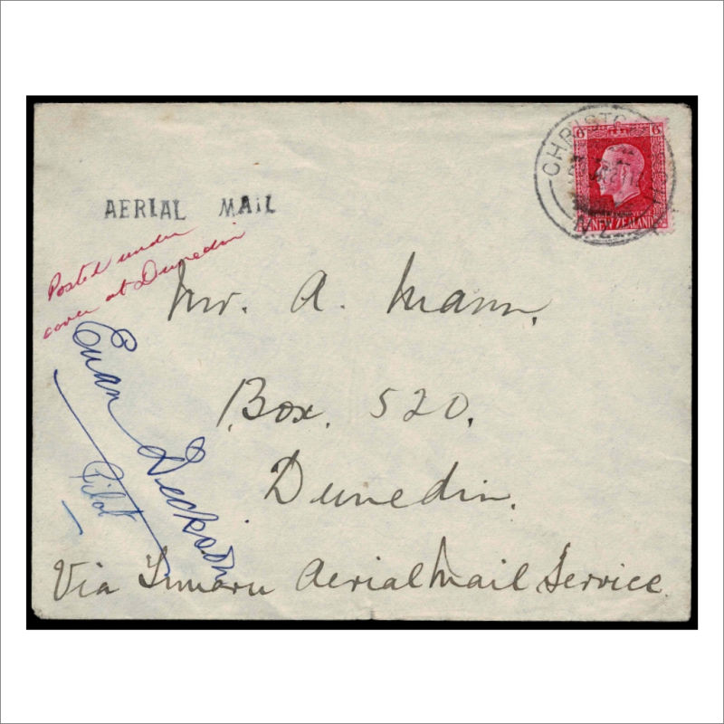 Christchurch-Timaru Pioneer Flight Cover NZAMC #27b with black ‘Aerial Post’ handstamp. Signed by Euan Dickson with KGV 6d Carmine. Also endorsed ‘Posted under cover at Dunedin’ in Red. Fine Cover (1) (Image)