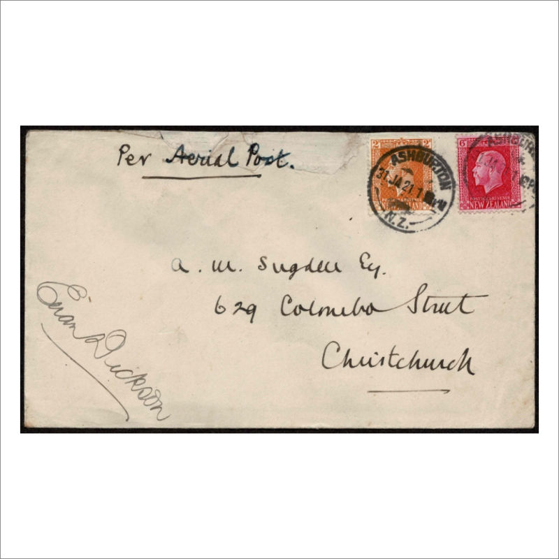 Ashburton-Christchurch Pioneer Flight NZAMC #27f endorsed ‘Per Aerial Post’ with KGV 2d Yellow Surface & 6d Carmine. Signed by Euan Dickson at bottom left. Very Scarce (1)