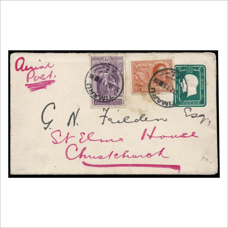 Timaru to Christchurch Pioneer Flight Cover NZAMC 27e on Uprated 1/2d KGV Printed envelope with additional 1 1/2d & 6d Victory values tied. Endorsed in Red ‘Aerial Post’ at top left. The cover has minor staining. Very Scarce. (1) (Image)