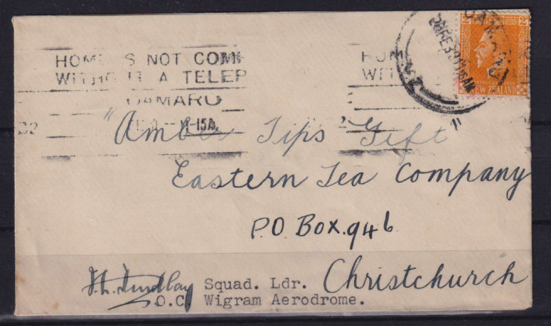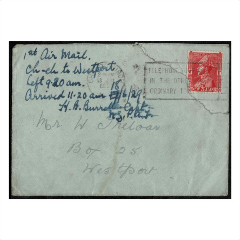 Christchurch-Westport, Karamea Earthquake Emergency Flight Cover endorsed ‘1st Air Mail Ch-ch to Westport Left 9.20am, Arrived 11.20am 18/6/29 H B Burrell Capt’ with 1d FM tied. The cover is torn at the top right. Very Scarce NZAMC 33a Cat $1500