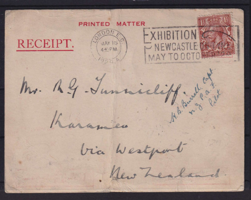 Associated Newspapers Ltd,London Printed Receipt sent from London addressed to Mr RG Tunnicliffe,Karamea,Via Westport,NZ. The card carried on the Murchison Earthquake Christchurch-Westport Flight NZAMC 33a The card signed by H B Burrell Capt NZPAF
