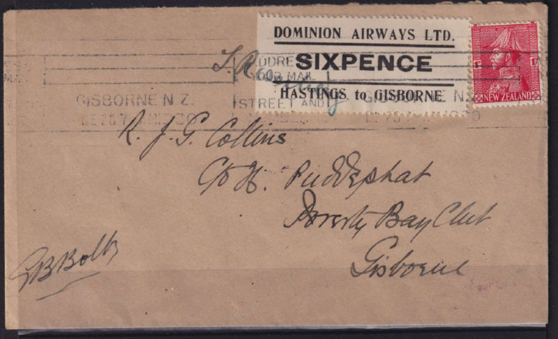 Dominion Airways Ltd/Sixpence/Hastings to Gisborne Printed label tied by Gisborne cancel. Signed by GB Bolt. The label signed by A Rosenberg. (1) (Image)