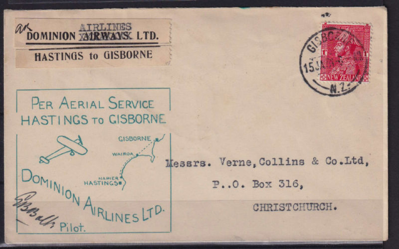 Dominion Airlines Ltd/Gisborne-Hastings Cacheted Printed Cover Posted at Hastings. Signed by GB Bolt (1) (Image)