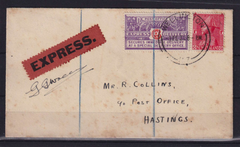 Wellington-Hastings Hawkes Bay Earthquake Emergency First Flight Cover NZAMC 41a sent by Express with 6d Fernleaves added. Has Express label and signed by GG Wallace the Pilot. Backstamped Hastings. The cover has light staining. Very Scarce (1) (Image)