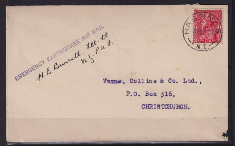 Hawke’s Bay Earthquake Emergency Flight Hastings-Feilding NZAMC #41c with Emergency Earthquake Air Mail cachet and signed by HB Burrell Flt-Lt. (1) (Image)