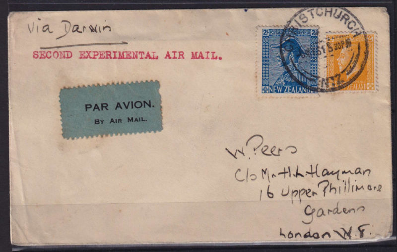 Experimental Flight Cover to London with 2/- Admiral & KGV 2d Surface Posted at Christchurch. Has ‘Via Darwin’ endorsement. NZAMC 51c (1) (Image)