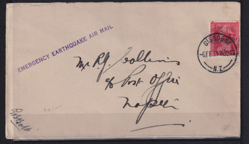 Earthquake Emergency Flight Gisborne to Napier NZAMC 41e signed by GB Bolt. Has Emergency Earthquake Air Mail violet cachet (1) (Image)