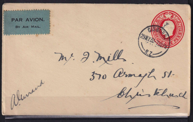 Dominion Airlines (Overstamped Airways) Ltd/Hastings to Gisborne Altered label on Printed Cover Posted at Gisborne (1) (Image)