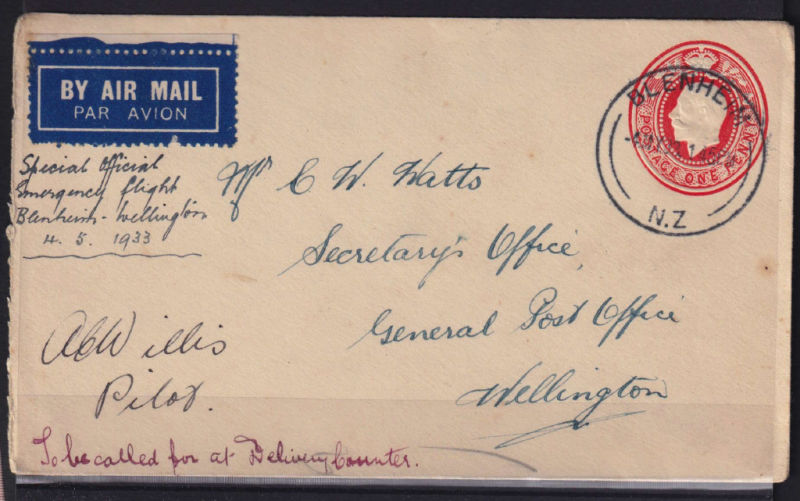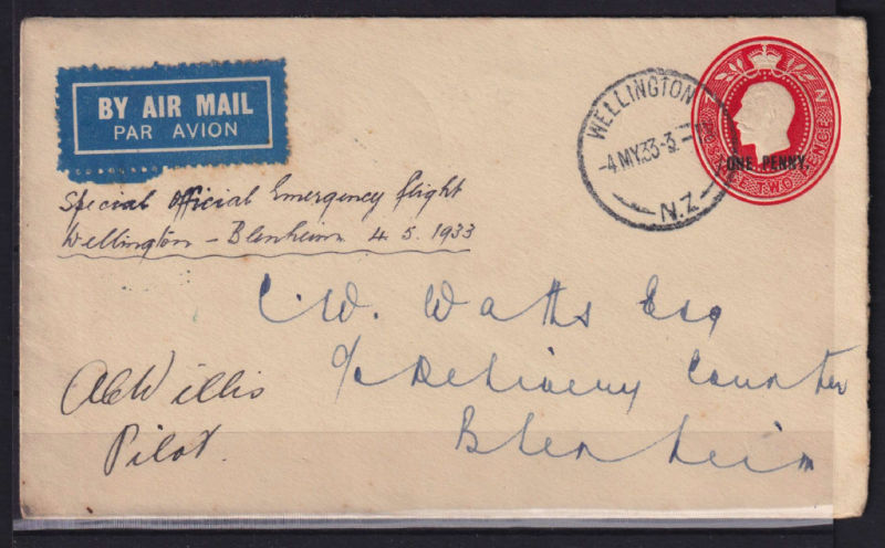 Emergency Strike Flight Wellington-Bleneim due to shipping strike NZAMC 95b on KGV 1d on 2d Printed envelope. Signed by AE Willis. Scarce (1) (Image)