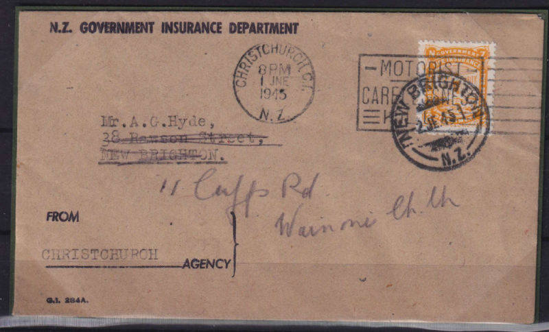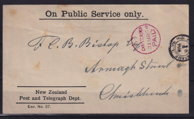 Public Service Only/NZ Post & Telegraph Dept Printed envelope Posted on the First Day of Moss Machine No 1 Meter with Christchurch Paid red handstamp at left to Christchurch. The cover has light ageing. Very Scarce First Day Meter Cover (1) (Image)