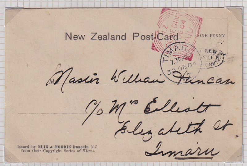 Franking Machine - the 1st Trial Period Impression on piece & 2nd Die Trail Used on Postcard dated 30 DE 1904 with the Meter cancelled with Dunedin Paid Squared Red cancel to Timaru with a receiving cancel. Nice Items (2) (Image)