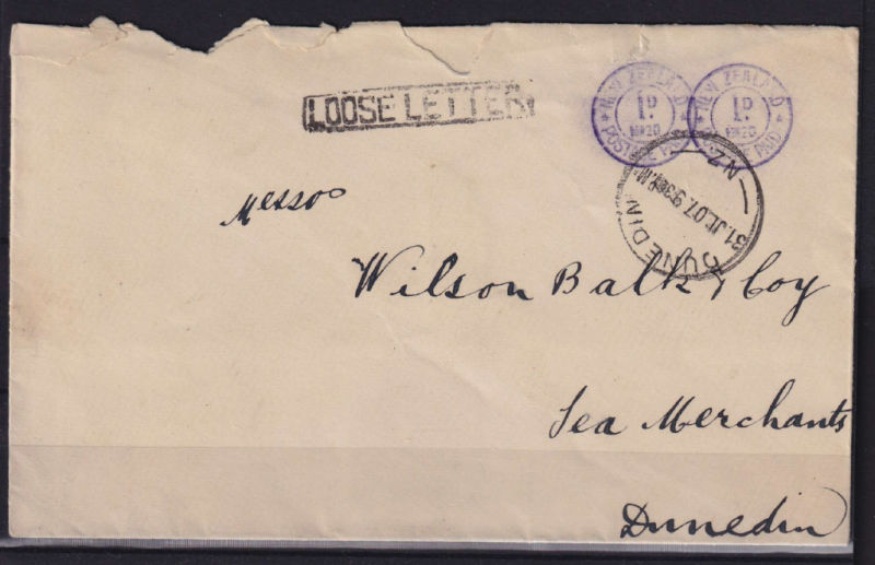 Union Steamship Co Printed envelope with 2x 1d No 20 Violet Moss No 4 Model C Meters with Dunedin cancel to a Dunedin address. Has Loose Letter black handstamp. The cover has been roughly opened at top. No backstamp. (1) (Image)