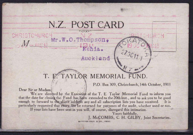 Tommy Taylor Memorial Fund Printed Postcard cancelled by Red Christchurch Paid 1/2d Machine cancel to Rehia. Has Tokatoka 27 OC 11 cancel. Fine Card (1) (Image)