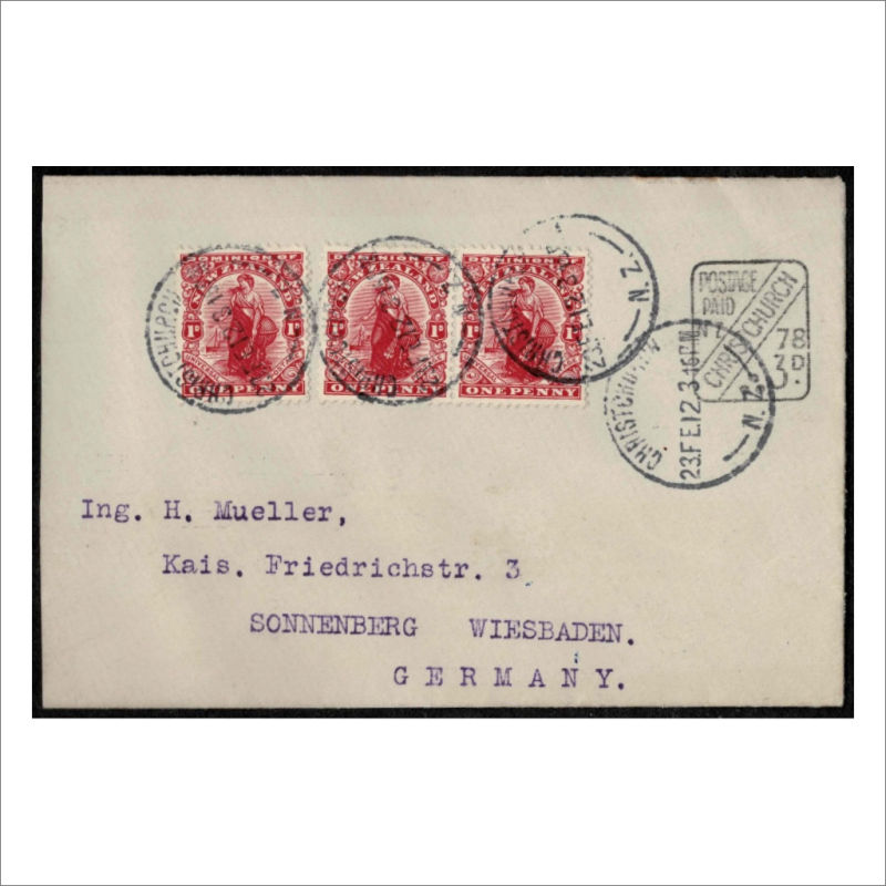 Cover to Germany with Black Postage Paid/Christchurch/78 3d Meter with 3x 1d Dominion stamps added and Posted from Christchurch. (Stamps were required on meter covers sent overseas) Fine condition (1) (Image)