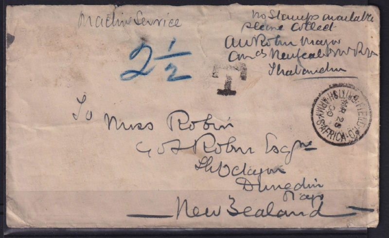 War Stampless ‘Cover endorsed ‘No Stamps available please collect A W Robin Major ...’ to NZ with ‘T’ Postage Due handstamp plus ‘2 1/2’ in blue manuscript. Has Field PO/British Army S.Africa cancel addressed to Miss Robin, Dunedin. (Major Robin was
