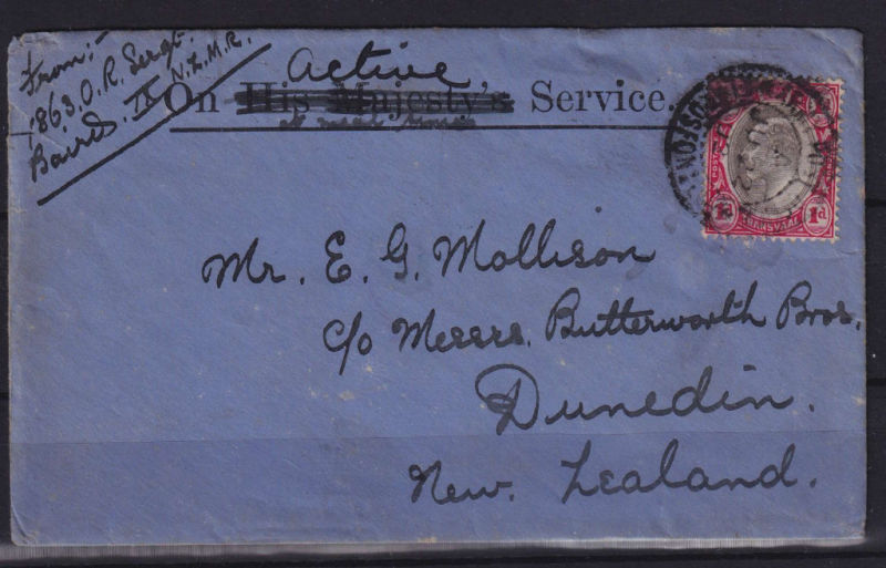 War Cover endorsed ‘On Active Service’ from 1863 OR Sergt/Bairds IX NZMR with Transvaal KEVII tied by Army Post Office/? indistinct town name to Dunedin. Backstamped Wellington & Dunedin. (1) (Image)