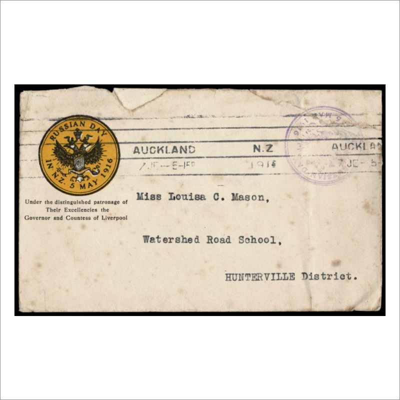 Stampless Printed ‘Russian Day in NZ’ envelope with Violet Russian Day 5 May 2016 cachet Posted from Auckland to Hunterville. The cover has been roughly opened at top and has a little staining. Backstamped Hunterville. Very Scarce WW1 Cover (1) (Image)