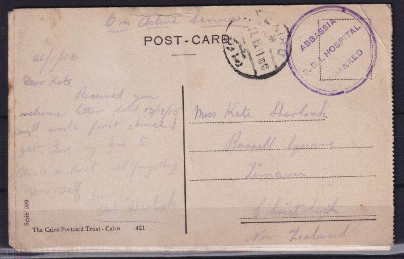 Stampless ‘On Active Service’ Postcard to NZ with fine violet ‘ABBASSIA/D.B.I. HOSPITAL/Franked’ cachet plus Cairo cancel at left. The card has minor ageing and a light corner crease. Also another similar card to the same addressee with Aust & NZ