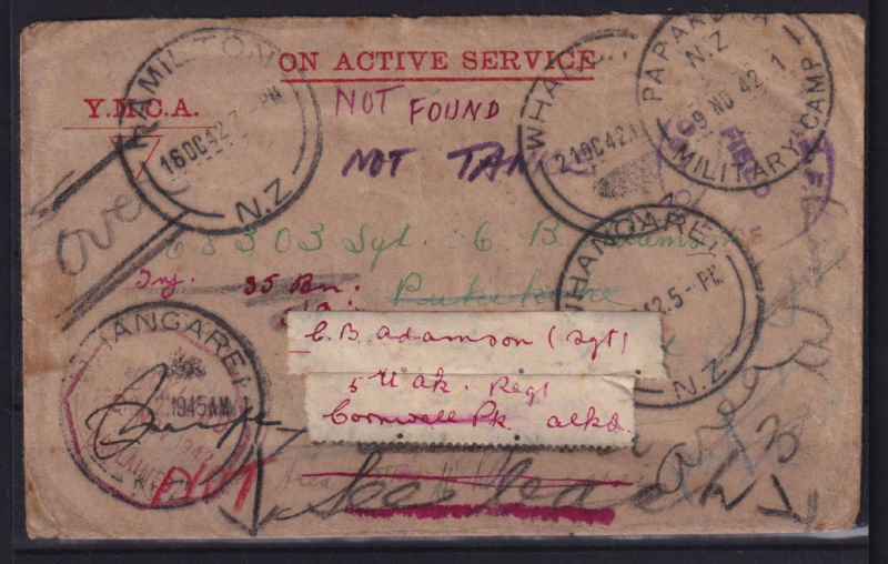 On Active Service Inwards Cover with part NZEF/Field/Post Office handstamps, the cover has been redirected with numerous cancels including Whangarei,Papakura Military Camp,Hamilton & Kensington Military Camp. Unclaimed cancel and ‘Not Found’ in