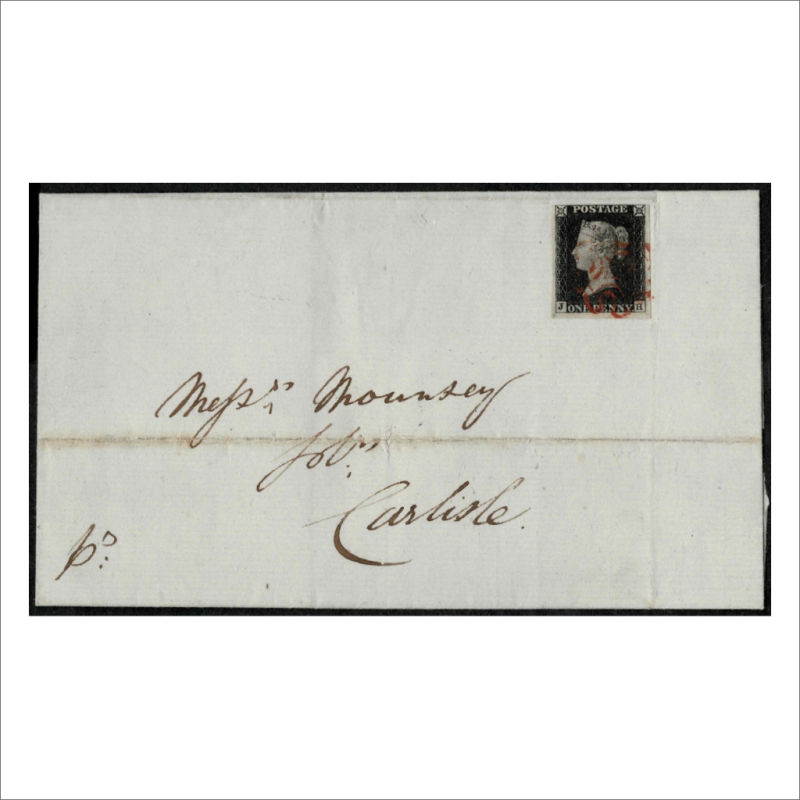 Outer Wrapper with QV 1d Black SG 2 Letters JH with 4 Close to Good Margins tied by Red Maltese Cross cancel addressed to Carlisle. Backstamped Kendal. (1) (Image)