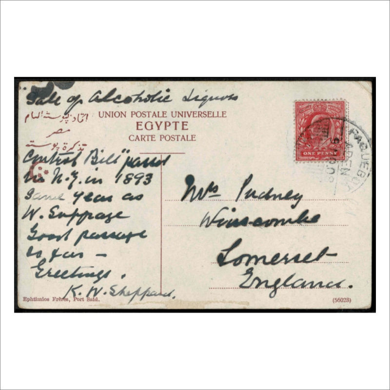 Picture Postcard 1d KEVII tied by Paquebot/Aden cancel sent by Kate Sheppard (signed) and in writing ‘Sale of Alcoholic Liquer Control Bill in 1893’ and refers to Women’s Suffrage. (Kate Sheppard was a Famous New Zealander & Activist). Fine & Rare