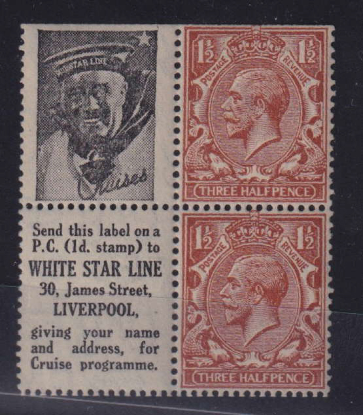 1/2d Booklet Pair with 2x White Star Line labels at left hinged at top. Cat £225 if 4 stamps (2) (Image)