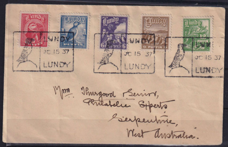 1937 (OC15) Cover to Western Australia with 1/2,1,6,9,12 Puffin values tied by Boxed Puffin cancels. (1) (Image)