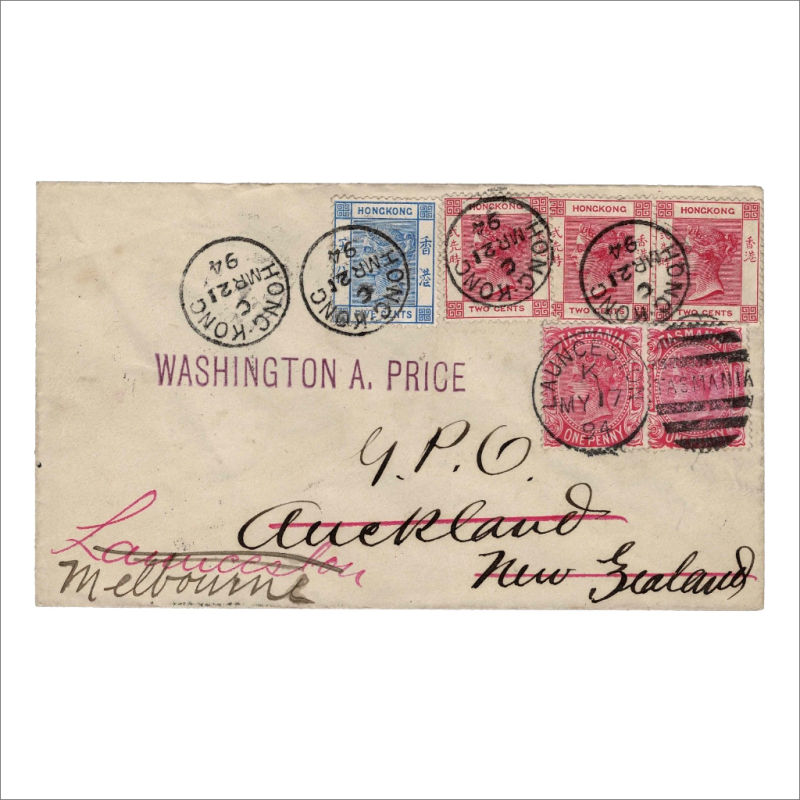 Cover with QV 5c & 2c(3) tied by HONG KONG/C cancels to NZ, redirected to Lauceston, Tasmania with Tasmania QV 1d Pair tied by MY 17 1894 Lauceston cancel and then redirected to Melbourne. Backstamped Auckland & Lauceston cancels. Nice redirection