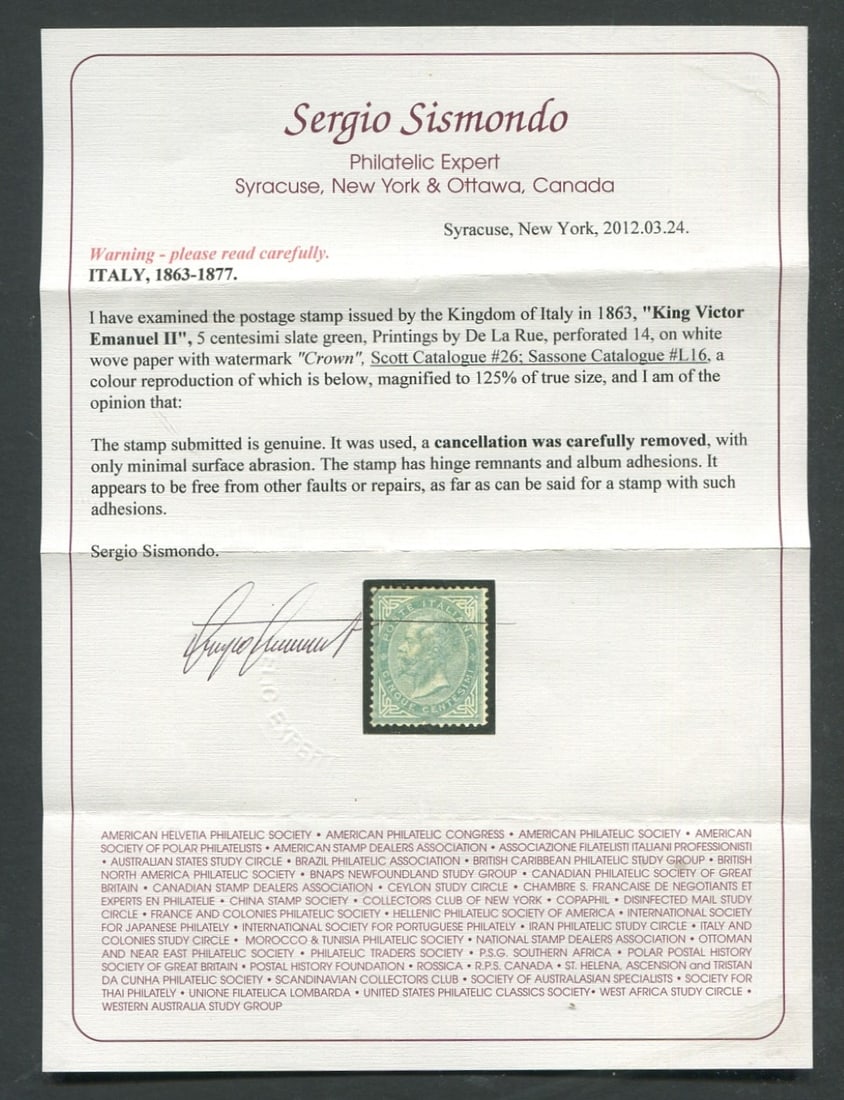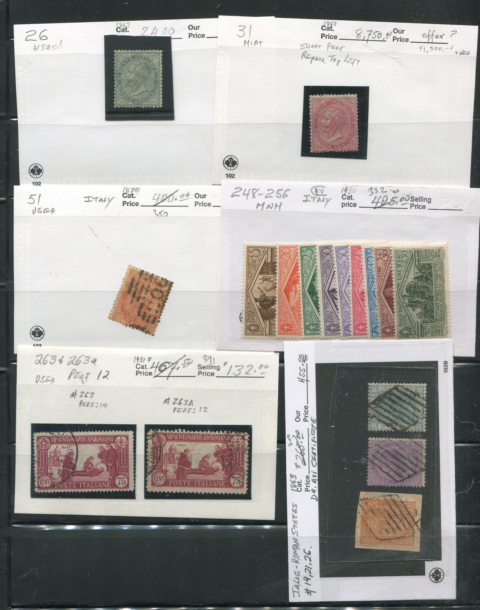 Italy and Italian States 1863 - 1931 , a group of 6 MH and used , includes #26 used, with removed cancel, backed up by 2012 Sismondo cert, #31 Mh repaired ti UL corner, #51 used, set #248 -256 MNH, #263 & #263a used and 19,21