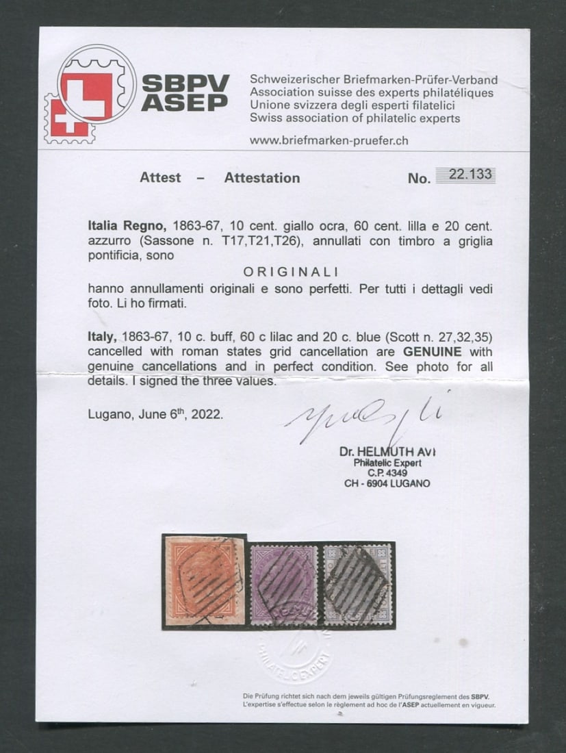 &26 used cancelled by Roman States Diamond grill with a 2022 Helmuth cert, Scott value $5273, appears f-vf (Image 1)