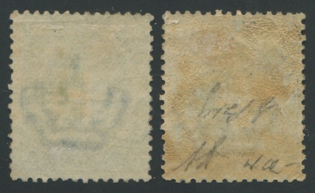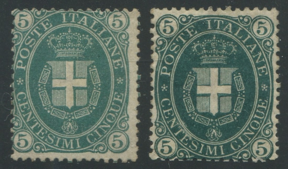 Italy 1889 #52, two MH 5c dark green (with shades), Scott value $1550,one has disturbed gum and toning issues, the otherbetter, appears f-vf (Image 1)