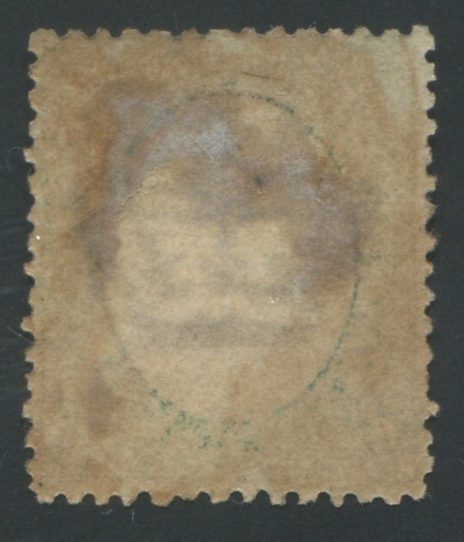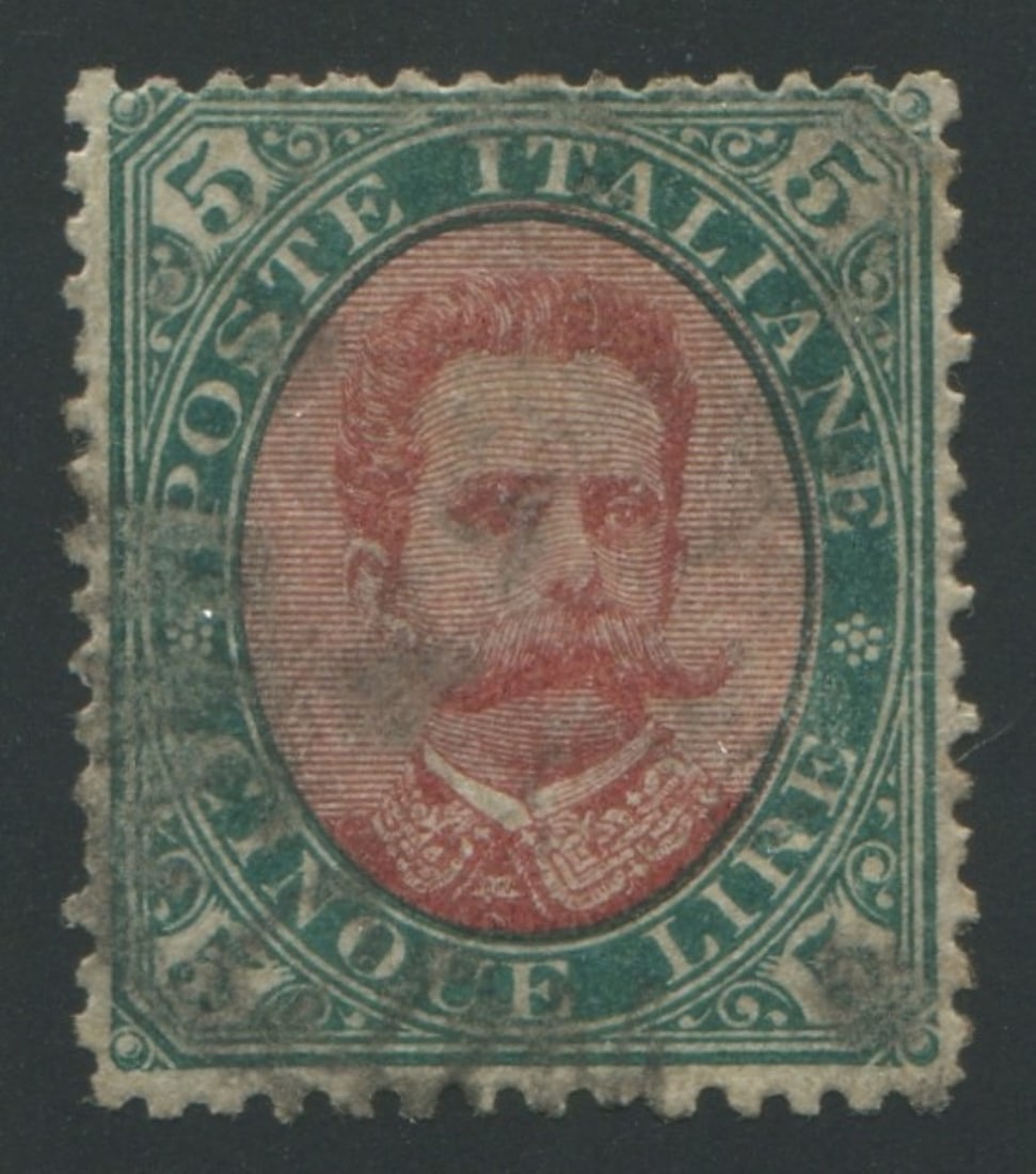 Italy 1889 #57, a used 5L green and claret, Scott value $1075, a few shorts perf, otherwise appears f-vf (Image 1)