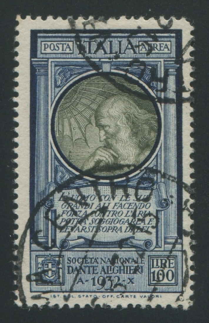 Italy - Air Post 1932 #C34, a used 100I bright blue and brown olive, Scott value $950, appears f-vf (Image 1)