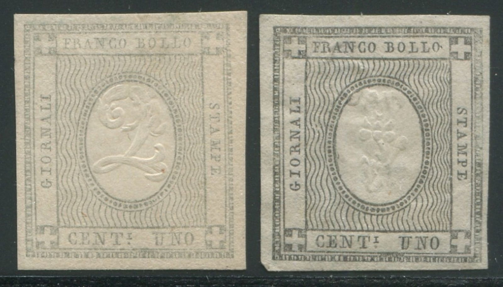 Italy - Sardinia 1861 Newpaper Stamps MH #P1a with numeral "2" instead of 1 and inverted figure 1. Scott value $3000 appears f-vf (Image 1)