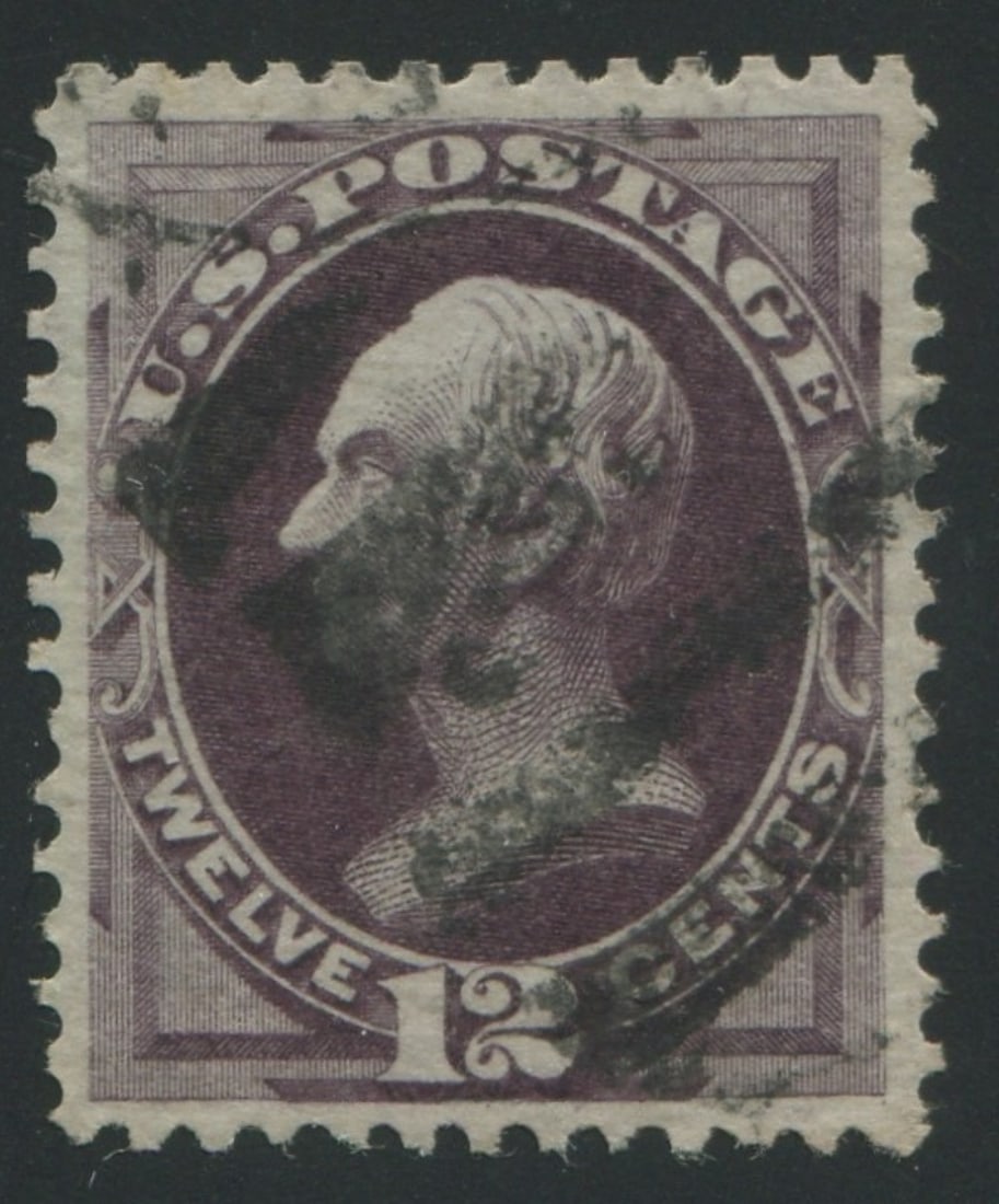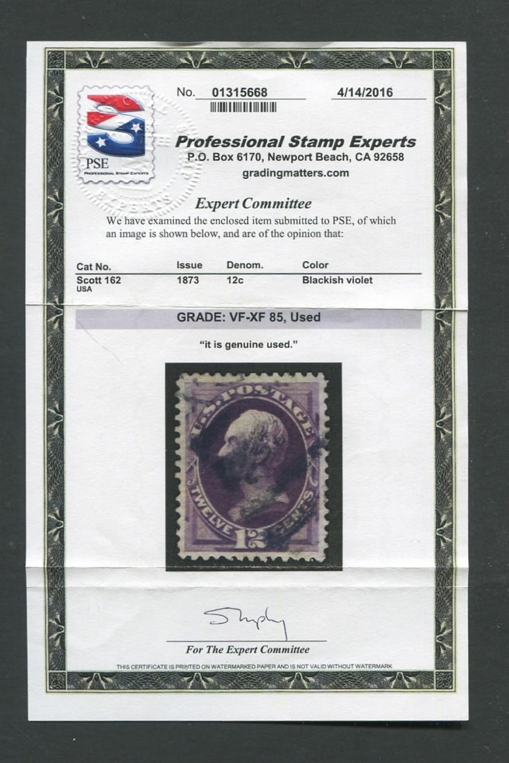 USA 1873 #162, 12c blackish violet, used, Scott value $225, has 2016 PSE Cert, grading as VF - XF (85) (Image 1)