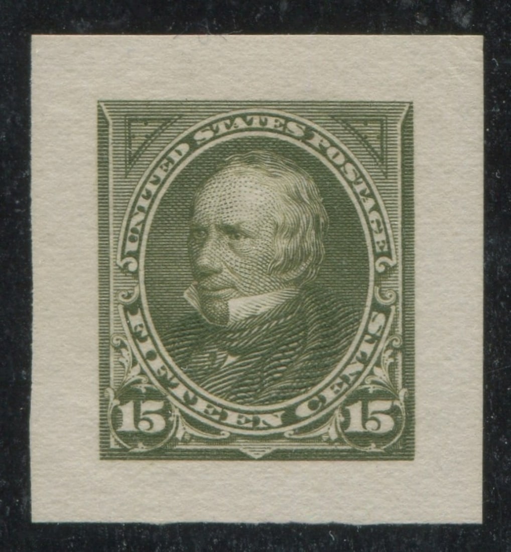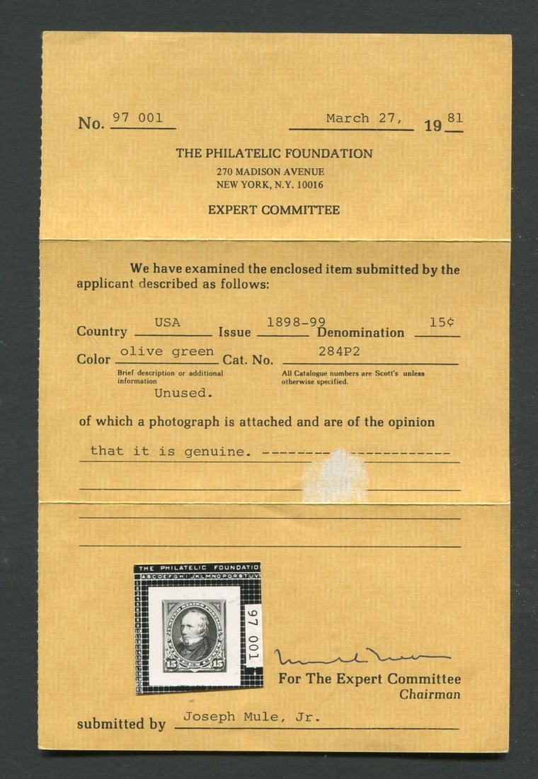 USA 1895 #284P2, a small die proof of the 15c olive green, has 1981 Philatelic Foundation Cert, appears f-vf (Image 1)