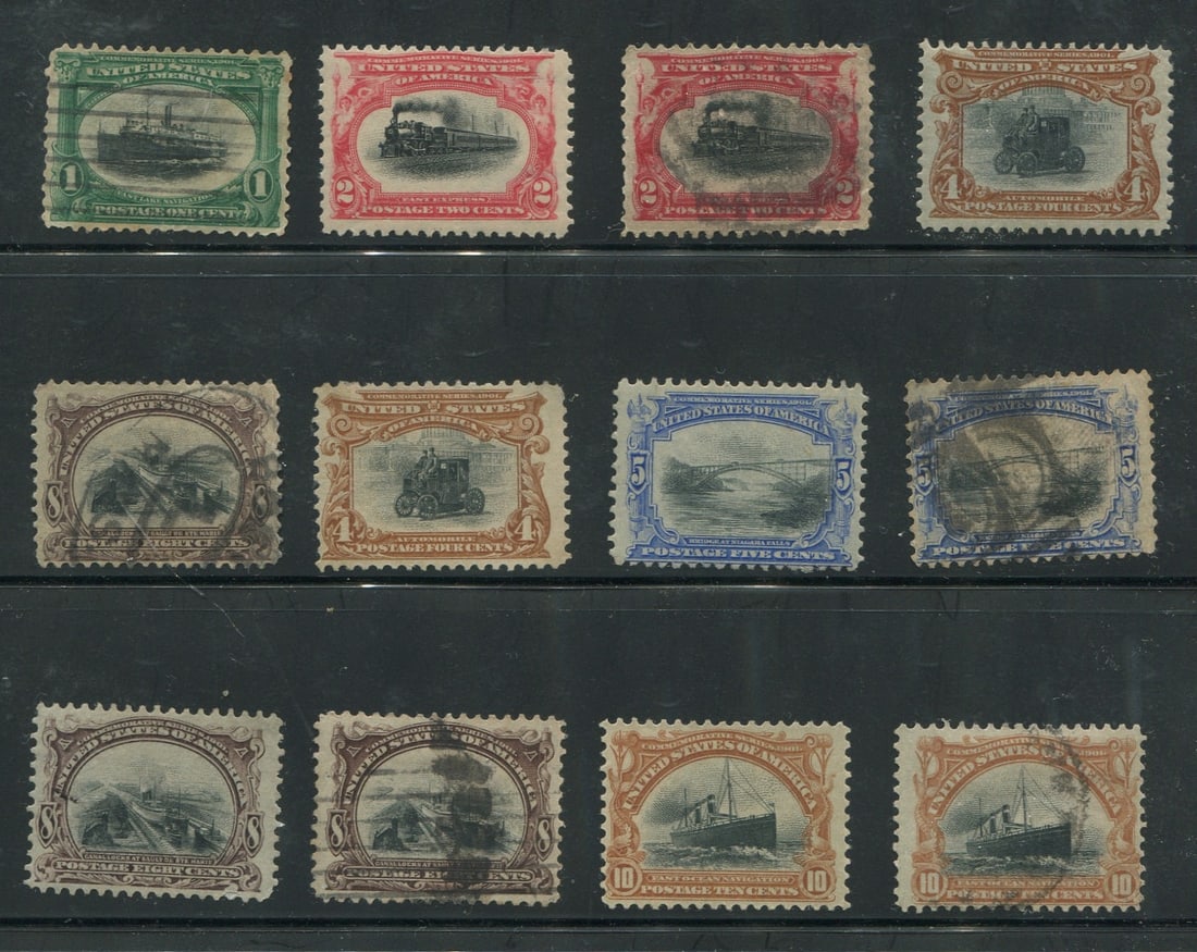 USA 1901 #294 / #299, a MNH, MNG and used selection of 12 stamps on a stocksheet, Scott value $839, appears fine (Image 1)