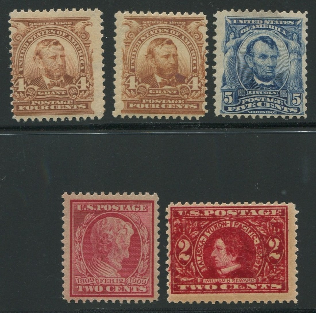 USA 1902 - 1909 #303 / #370, a MNH group of 5, includes #303 x2 #304, #369 and #370 printed on gum side, Scott value $730+, appears fine (Image 1)