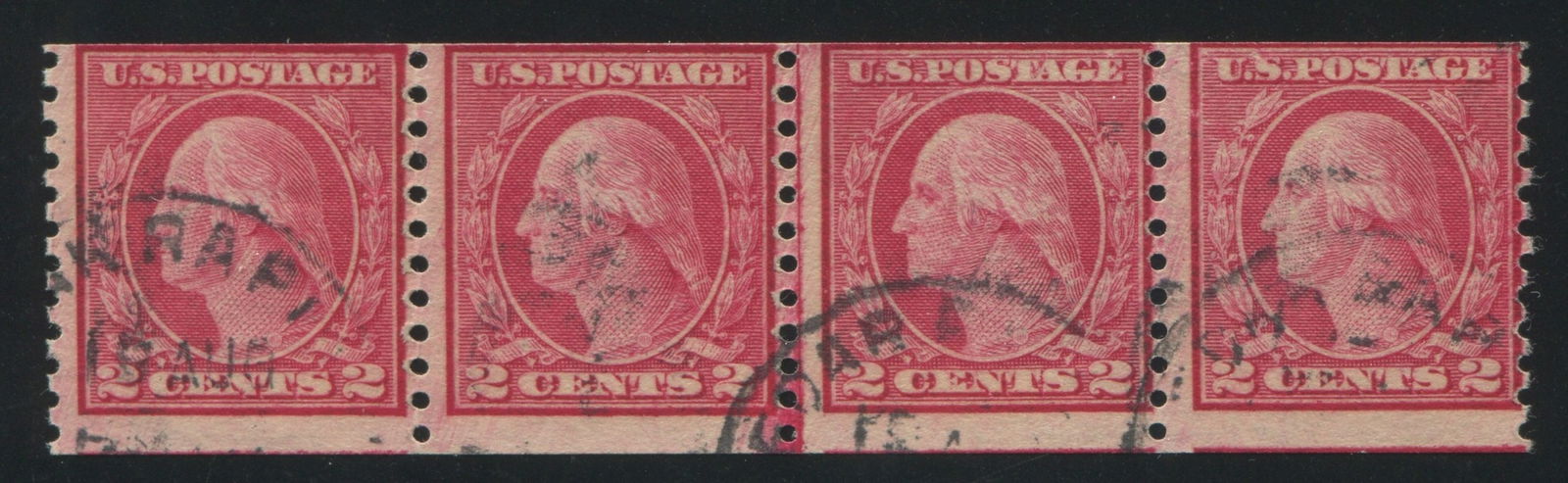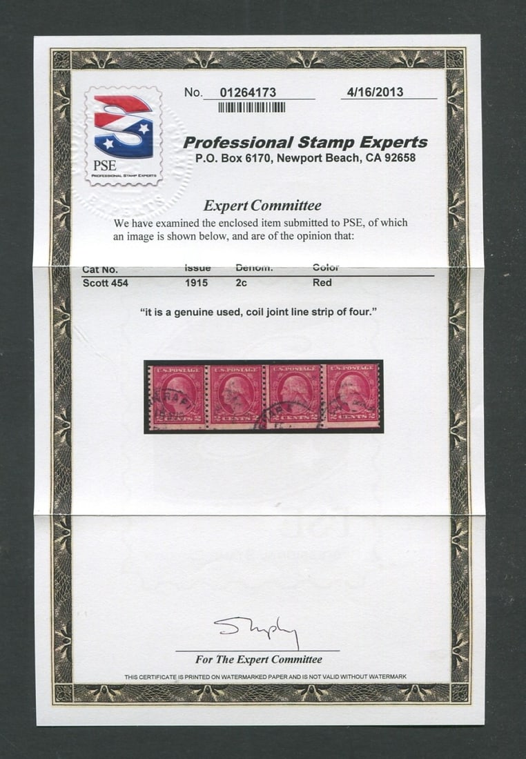 USA 1914-1916, #454, a used coil joint strip of four, has 2013 PSE Cert, Scott value $600, appears f-vf (Image 1)