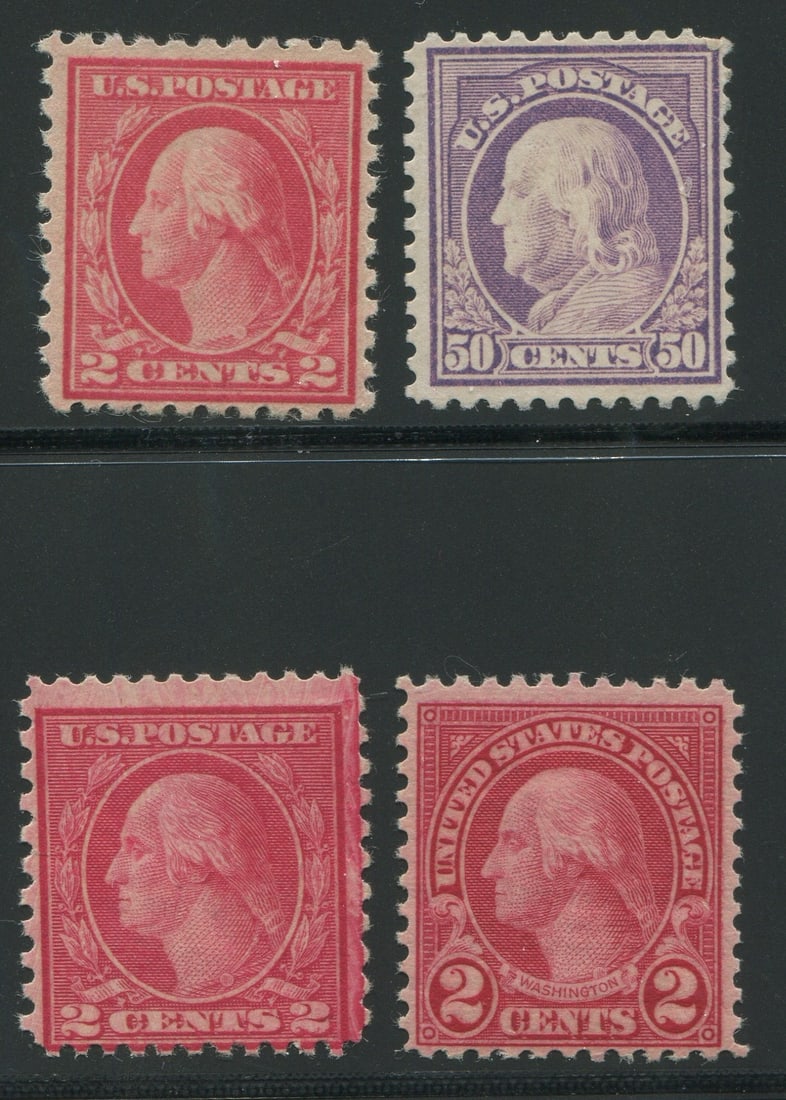 USA 1917 - 1923 #500 / #595, a group og four stamps, including #500 2c deep rose MH type I, #517 50c red violet perf 11 MNH, #546 2c carmine rose type III MNH and #595 2c carmine perf 11 x 11 MNH, Scott value $1060, appears