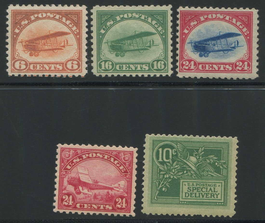 USA 1918 #C1 -#C3 complete set MLH, air post, 1923 #C6 24c carmine MNH air post and 1908 10c green MNH Special Delivery stamp, Scot value $450, appear f-vf (Image 1)