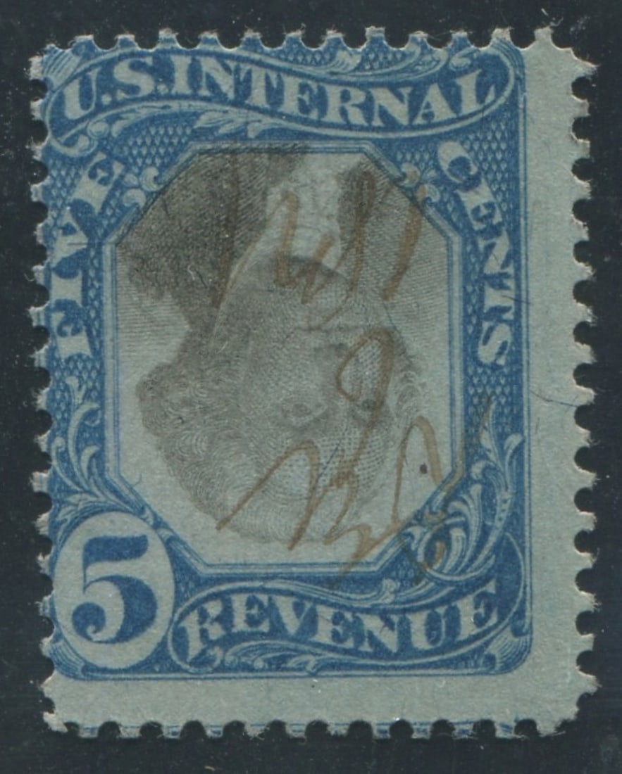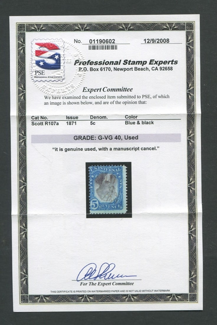 USA 1871 #R107a, a used 5c blue and black, with inverted centre, with a manuscript cancel, has 2008 PSE Cert, G -VG (40) (Image