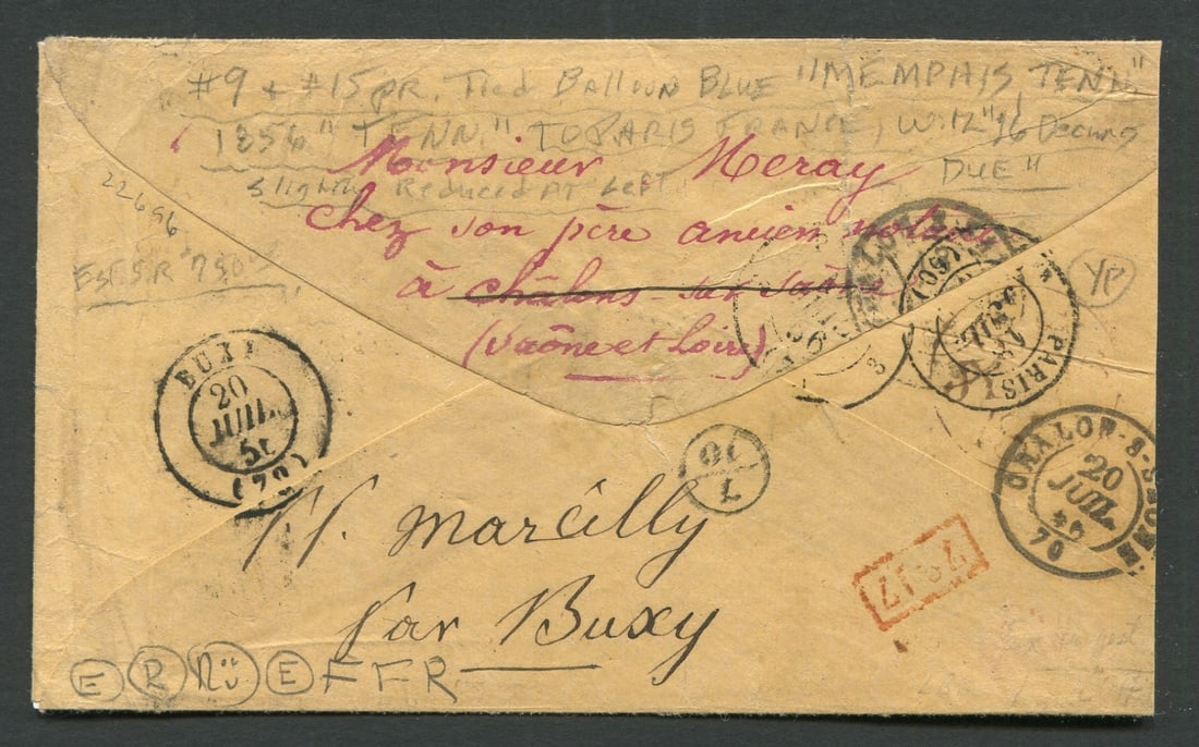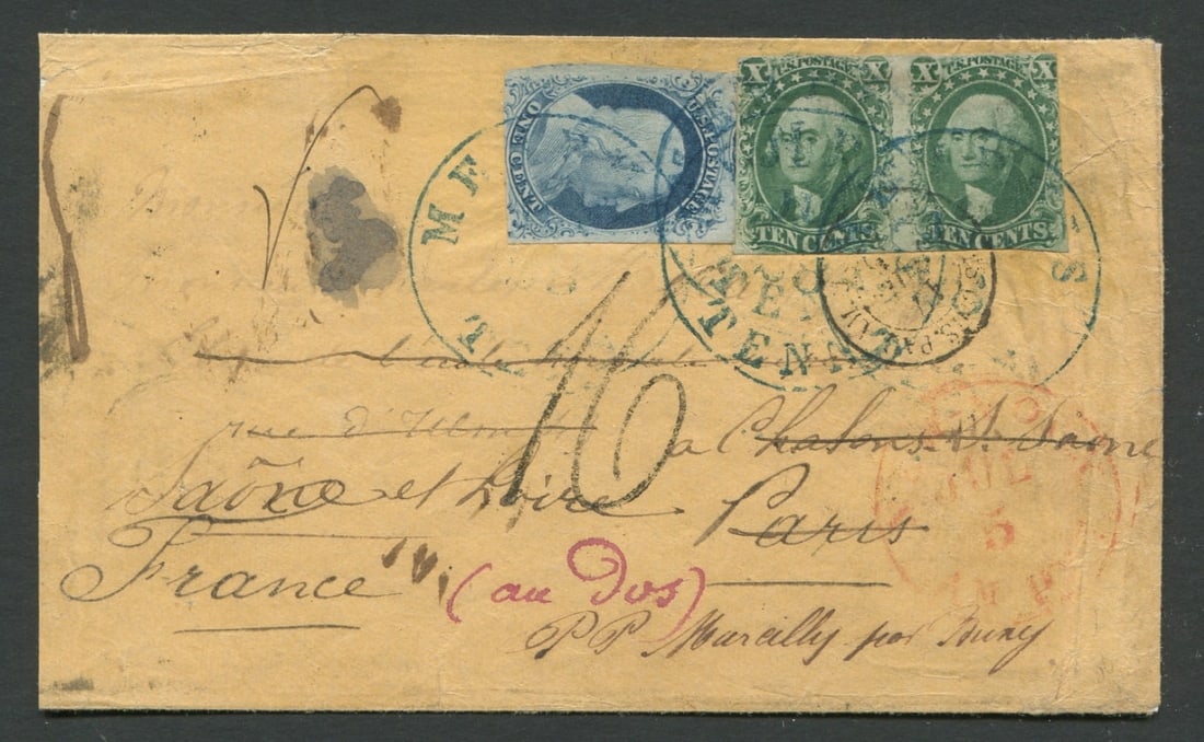 USA 1851 - 1857, #9 and #15 (pair), tied by blue Memphis Tenn. cds, on 1856 transatlantic cover to Paris, France, where it was re-directed many time, with numerous backstamps, appears very good (Image 1)