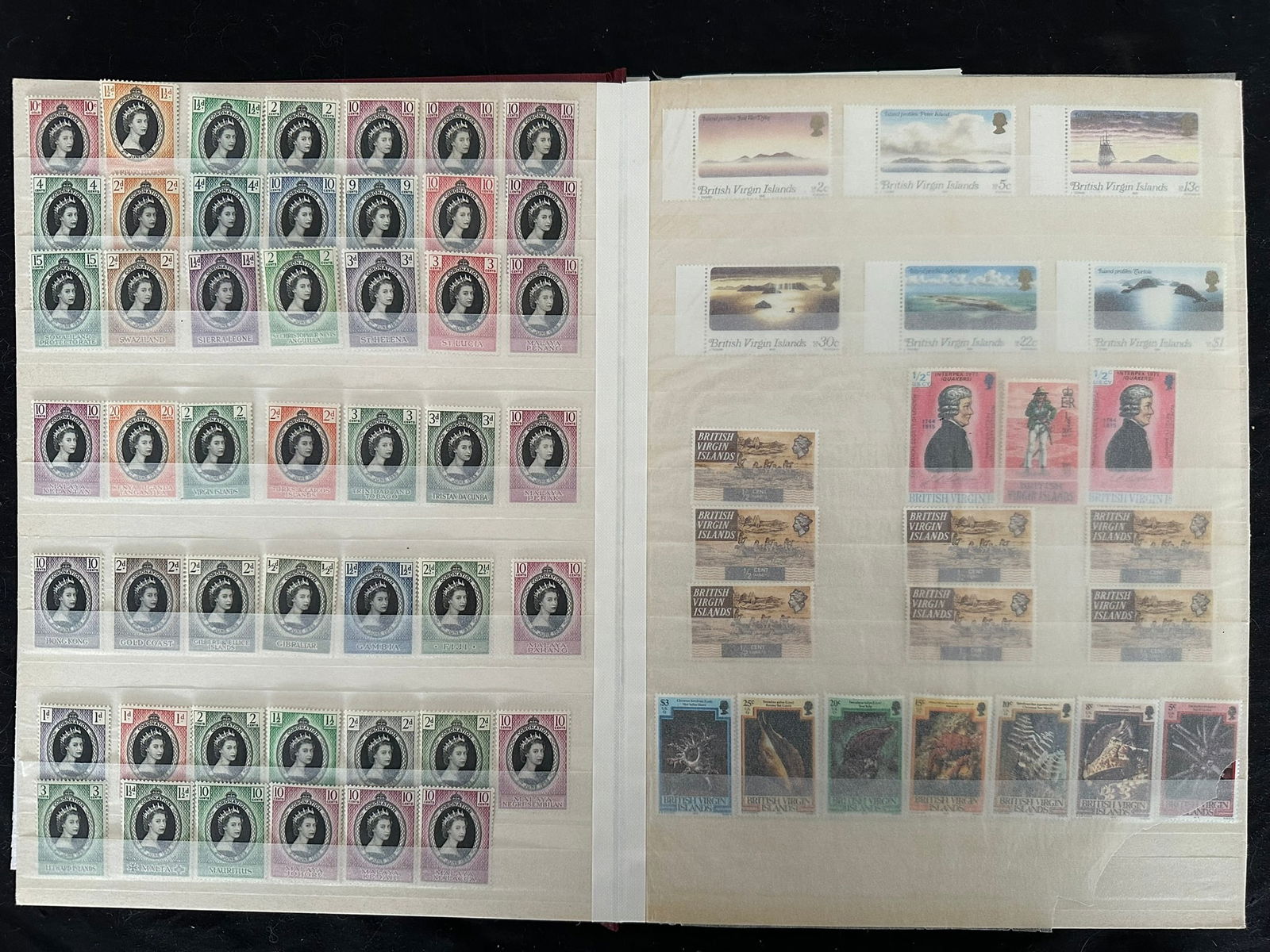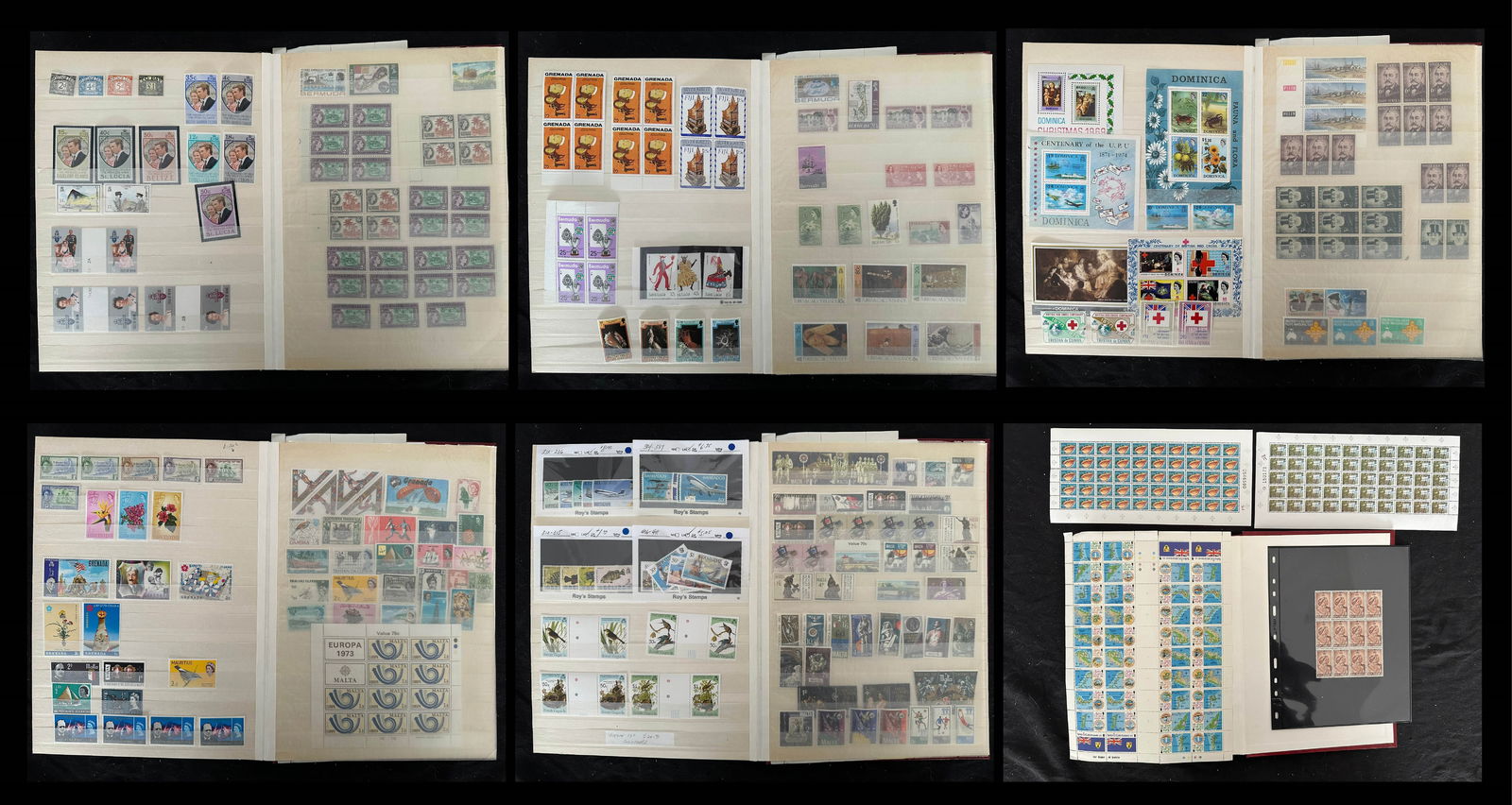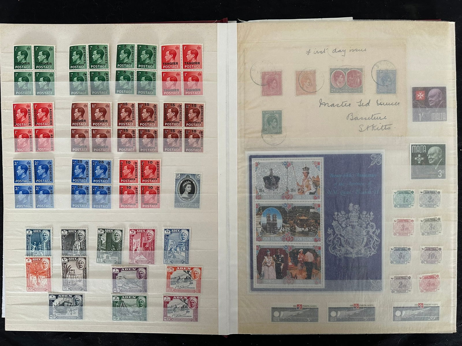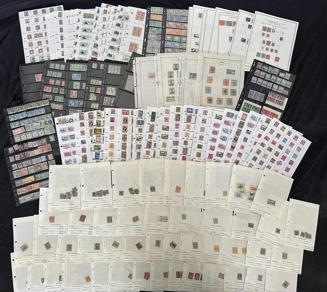 924 imageBritish Commonwealth collection in Stock book, Many Countries, and many Mint NH, 1050+ stamps, Est. Cat. $750.00, Gibraltar #29-38 (no 31A), mint* f-vf, Cat.$260.00, Bermuda GV, GVI and QEII, #127 revenue cancel, FDC QE 25th Anniversary of Coronation, Antigua 1970 ship issue multiples, Saint Lucia, 48 1953 Omni bus Coronation Issue, British Virgin Islands, including #520-523 Gutter pairs, Morocco Agencies overprints on Edward VIII GB issues in blocks, Aden up to 10 /-, Saint Kitts- Nevis FDC GVI, Cook Islands, Malta incl. Postage Due, Cayman Islands, 3 Aitutaki Souvenir sheets, GB Coronation QE FDC 1/-6 Long Live the Queen cancel, Various Silver Jubilee issues, Queen Mother 80th mini-sheets Gibraltar, Niue, Sierra Leone , Isle of Man, Suid-South Africa pairs GVI Coronation, GV Silver Jubillee, Christmas Islands, Rhodesia & Nyasaland QEII 1/2d - 10/-, Gilbert & Ellice Islands Dominica Souvenir sheets, Turks & Caicos #506 in full sheet of 40 Tete-Beche with Gutter, 1 fold, Ghana 1 sheet of 50 1357A & 1 sheet 1357E. An interesting mixed lot, certaqinly worth the estimate. (Image 1) (Image 2) (Image 3) (Image 4) (Image 5) (Image 6) (Image 7) (Image 8) (Image 9) (Image 10)